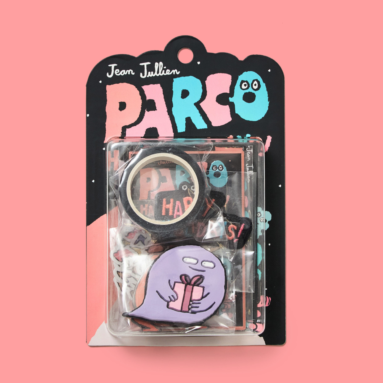PARCO HAPPY HOLIDAYS 캠페인 비주얼을 실시한 브리스터 팩에 총 7점(알루미늄 마그넷, 프레이크실, 핀 배지, 마스킹 테이프, 와펜 씰, 러버 마그넷, 미니 카드) 들어간 오리지널 선물이 됩니다